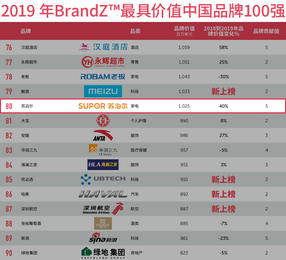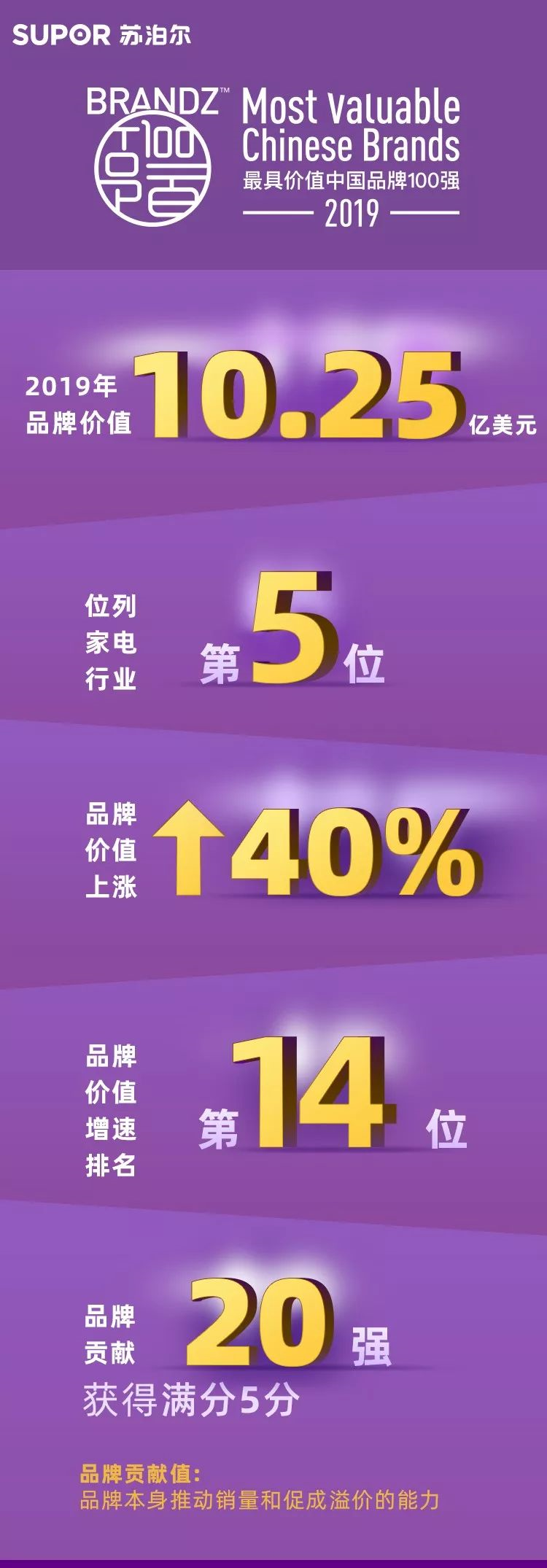 2019年 BrandZ?最具價值中國品牌100強排行榜發布,蘇泊爾連續7年上榜,品牌價值10.25億美元,位列家電行業第5位。