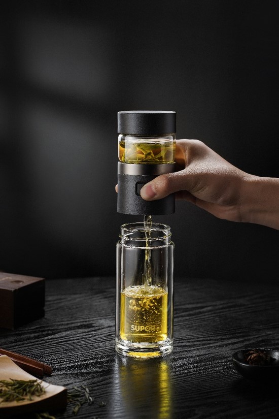 茶倉中加入茶葉,開始泡茶,旋合杯蓋;當(dāng)茶倉里的茶水,達(dá)到適宜個人口味的濃度時(shí),一鍵按壓茶水分離器上的按鈕;茶倉中的茶水就能過濾至下面的杯身中,一杯濃淡均勻、口感純凈的好茶就泡好了。