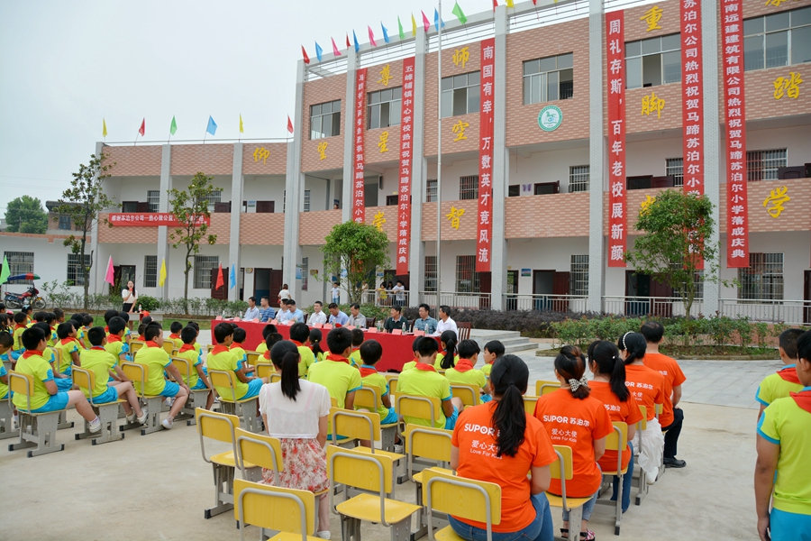 6月19日,蘇泊爾公司總裁助理林秉愛(ài)一行,與湖南區(qū)域經(jīng)銷商長(zhǎng)沙浩欣梁總、邵東文斌李總一道,穿過(guò)高霞山下碧綠的田野,來(lái)參加馬蹄蘇泊爾小學(xué)的落成典禮。