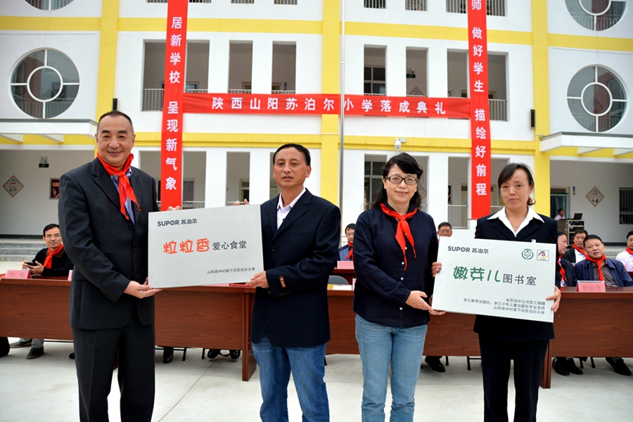 蘇泊爾公司總裁戴懷宗先生與山陽縣政府李偉縣長一起為下河蘇泊爾小學揭牌。