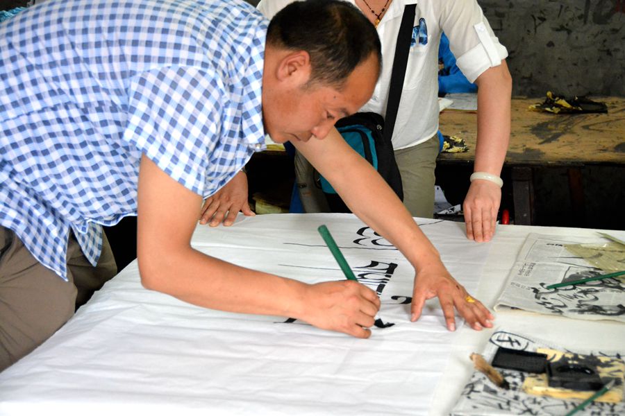 索南才讓老師是青海同仁全都蘇泊爾小學的藏語文老師,略羞澀的藏族老師習慣于用細致入微的凝視和傾聽來感知長坑小學的一切。在參觀長坑小學的學生社團活動和過程中,走到書法教室的索南老師拿起紙筆,揮毫落紙為長坑小學和在場的老師寫起了藏文書法。與他交談得知,索南老師勤練藏文書法多年,曾用5天的時間輔導自己的學生入門學習書法,并在全縣的藏文書法大賽中獲得一等獎。長坑小學涵蓋婺劇、民樂、書法、美術等內容的社團課程體系讓索南老師大受啟發,預備回校后也會借鑒經驗開展書法類、棋類、球類及墻報的特色教學活動。