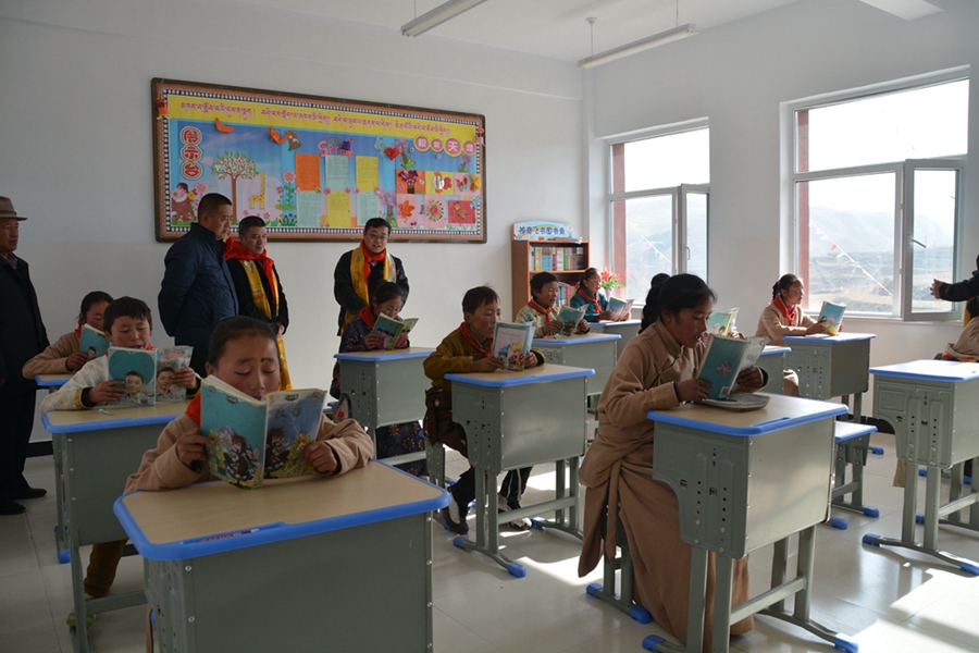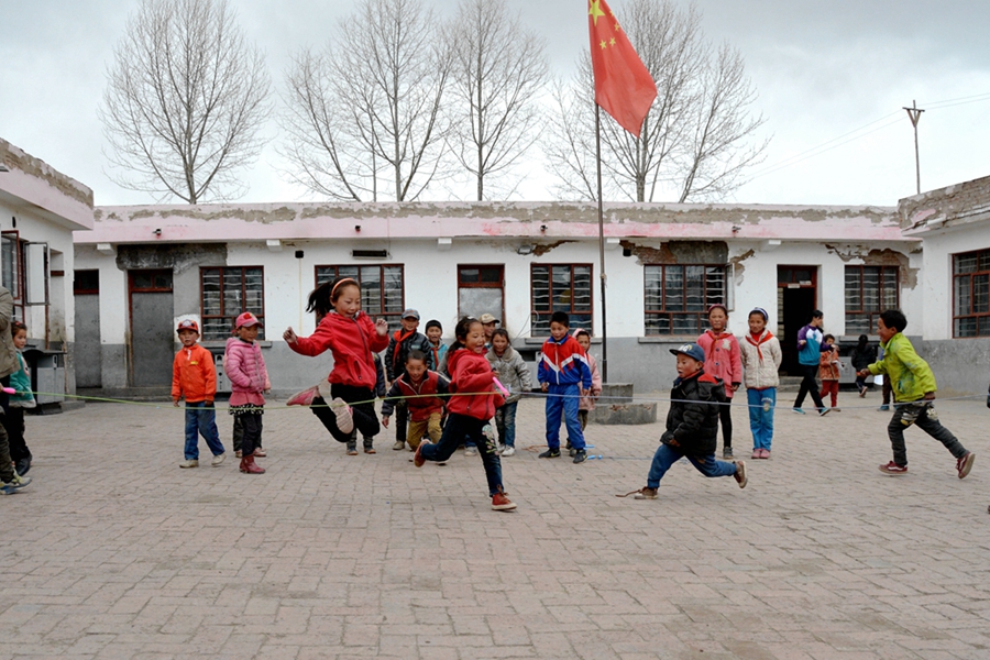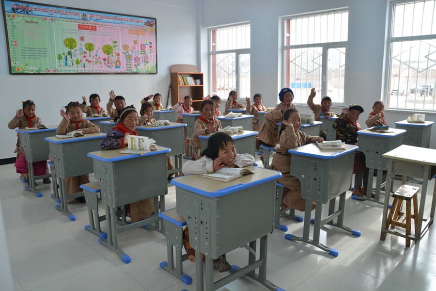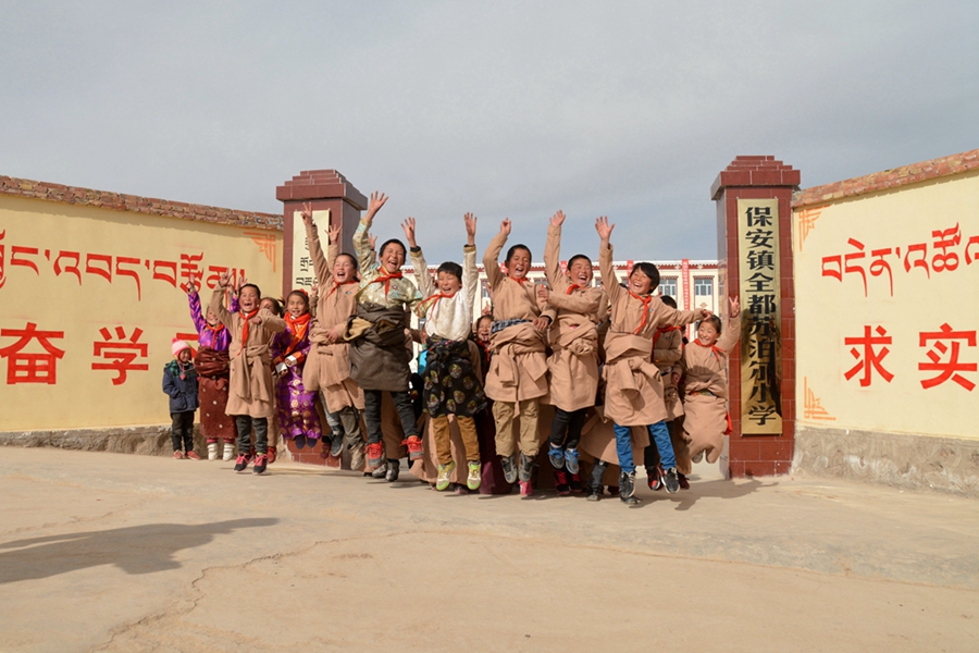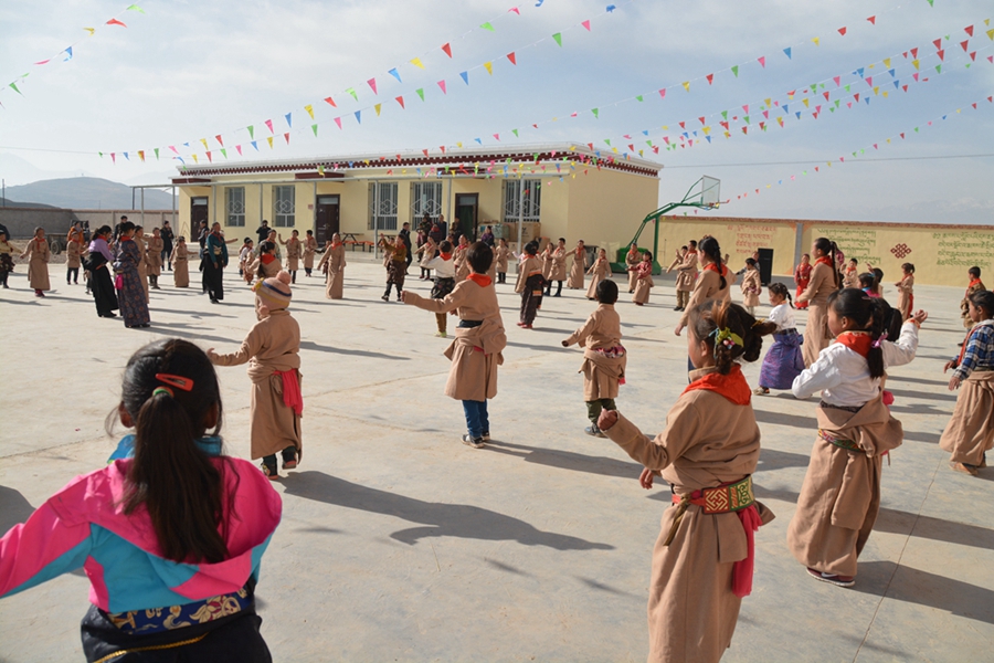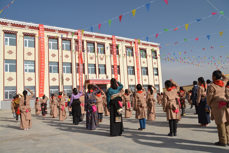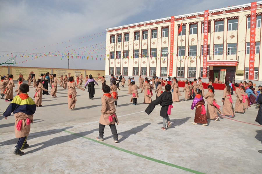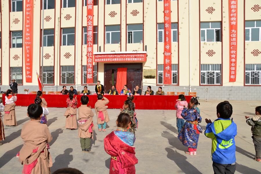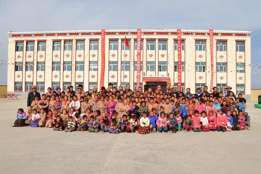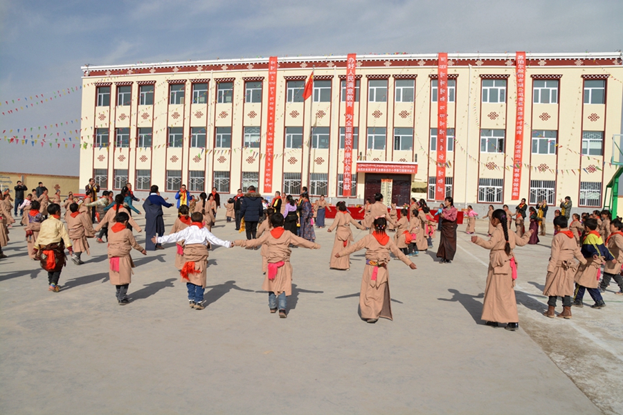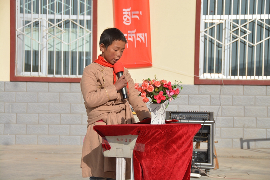 陽光與愛心一樣溫暖,藍(lán)天如孩子一樣純凈。六年級(jí)的男孩完瑪加今天代表小朋友們?cè)诼涑傻涠Y上發(fā)言,用質(zhì)樸的語言講述他的心聲?!耙郧拔液臀业耐瑢W(xué)們?cè)跓艄饣璋怠ζっ撀?、屋頂透風(fēng)的教室里學(xué)習(xí),在坑坑洼洼的操場上玩耍,端著碗蹲在沒有遮擋的墻根吃飯,冬天還要忍受寒風(fēng)的肆虐。在那樣艱苦的環(huán)境中我們一起并肩前行,度過了六年的時(shí)光。如今,我們的新學(xué)校盛裝打扮,教學(xué)樓拔地而起,國旗高高飄揚(yáng),操場平整如紙,教室溫暖明亮,食堂整潔雅致,還有藏書豐富的圖書室。今后我們將在這樣美好的環(huán)境中學(xué)習(xí)生活,我心中充滿了喜悅和感恩?!?