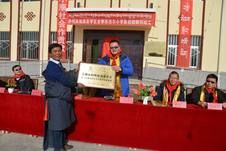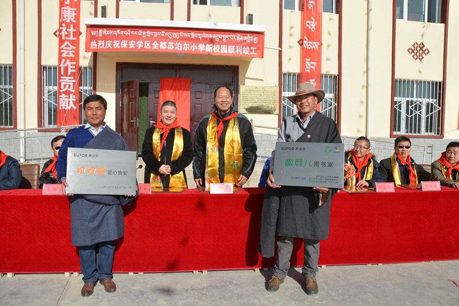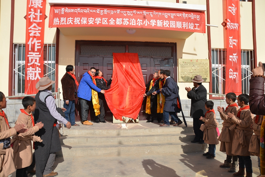 山路蜿蜒,情誼綿長。這個(gè)給藏家孩子們帶來冬日溫暖的新學(xué)校,凝結(jié)了許多的社會(huì)愛心。11月24日,是新校園舉行落成典禮的日子。這一天,蘇泊爾公司林總、碩源基金會(huì)李秘書長、持明基金會(huì)司總、西寧萬捷郭總、西寧志恒張總一行愛心企業(yè)和基金會(huì)的代表,一起來到了這個(gè)海拔3300多米的小山村,與老師和孩子們共同慶祝新學(xué)校的落成。