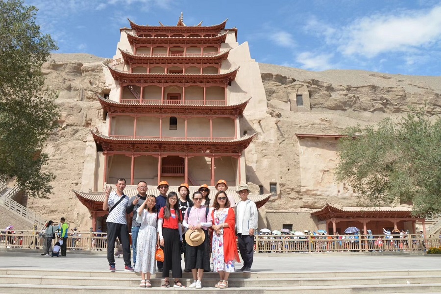 巍巍千載敦煌,浩浩藝術大觀。老師們來到游學的最后一個游覽景點——敦煌莫高窟,這里是藝術的殿堂,一座石窟,是一個世界,一孔洞穴,是一截歷史。它見證了歷史滄桑,見證了世事變遷,也許老師們看完那一幅幅精湛的壁畫后,會不禁感覺這大漠,竟還有些溫柔。從人間煙火到凈土莊嚴,從凡俗糾纏到飛天翩然,匠人們將技藝融入虔誠,將畢生揮灑石窟,血汗辛勞,筑出俯視悲歡的靈光幻妙。