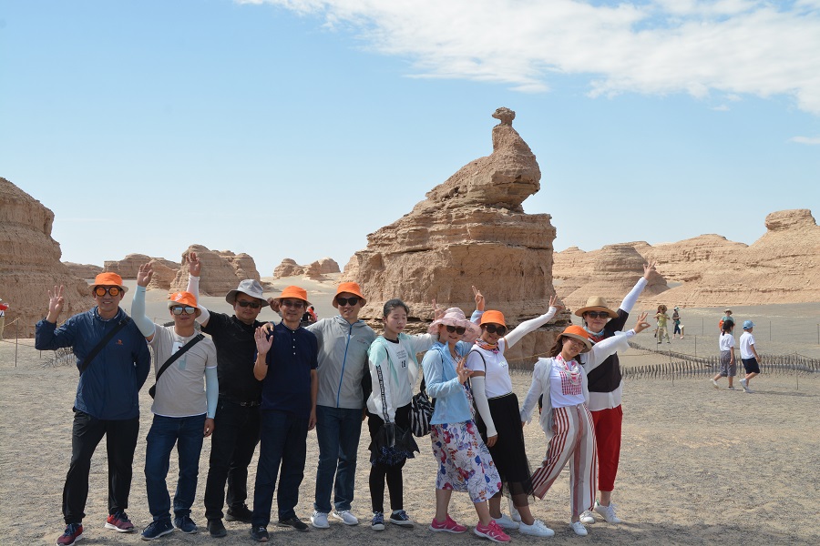 萬里敦煌道,三春雪未晴。送君走馬去,遙似踏花行。別過瓜州,繼續往西,老師們便來到河西走廊上最后一座節點城市——敦煌。歷來沙漠清泉難以共存,但在敦煌,卻能看到沙漠與清泉相伴相守。駝隊緩緩的走在落日下的大漠,鳴沙山下的綠洲,在大漠中是那樣的令人動容,不禁讓老師們眼前一亮。次日,老師們還去到了離敦煌城外不遠處的雅丹地質公園,感受著千萬年的自然沉淀,有種震撼人心的力量。