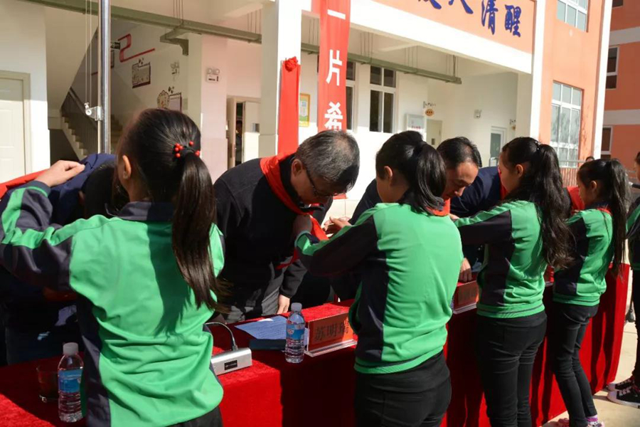 少先隊員代表給各位遠道而來的領導嘉賓佩戴紅領巾。