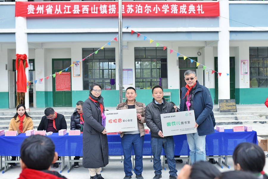 典禮上,蘇總和陳秘書長(zhǎng)向?qū)W校贈(zèng)送了嫩芽?jī)簣D書室和粒粒香愛心食堂的牌匾,這代表了公司一如既往地關(guān)心蘇泊爾小學(xué)孩子們學(xué)習(xí)和生活的方方面面。