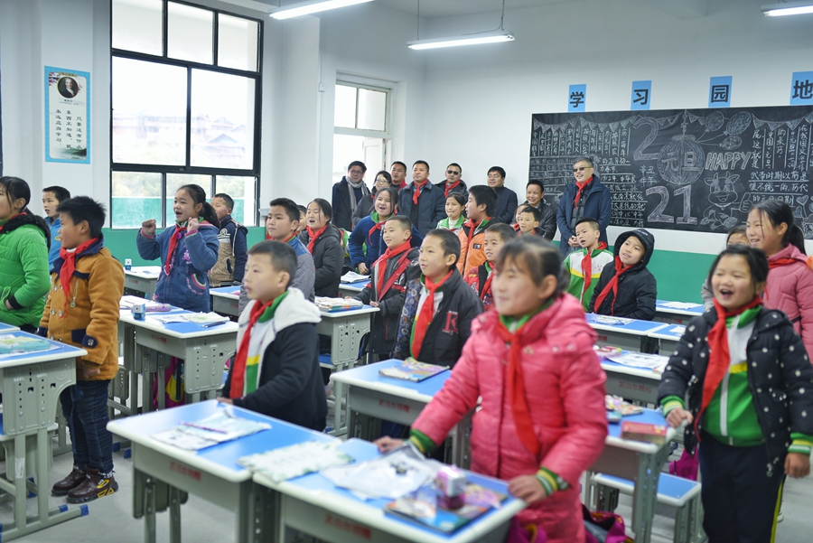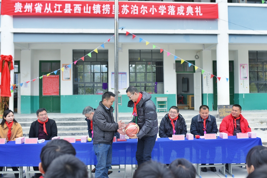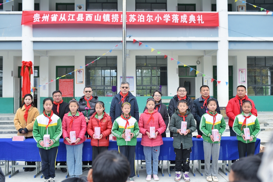 在孩子們的簇?fù)砗鸵娮C下,蘇總與當(dāng)?shù)卣I(lǐng)導(dǎo)一起為從江縣西山鎮(zhèn)撈里蘇泊爾小學(xué)揭牌。