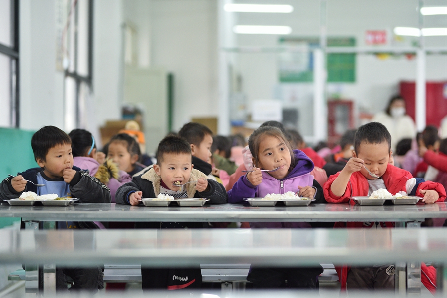 粒粒香愛心食堂里,孩子們熱熱鬧鬧地坐在一起,津津有味地吃著午餐。