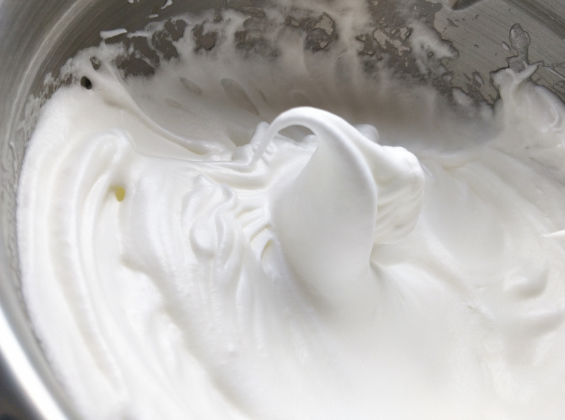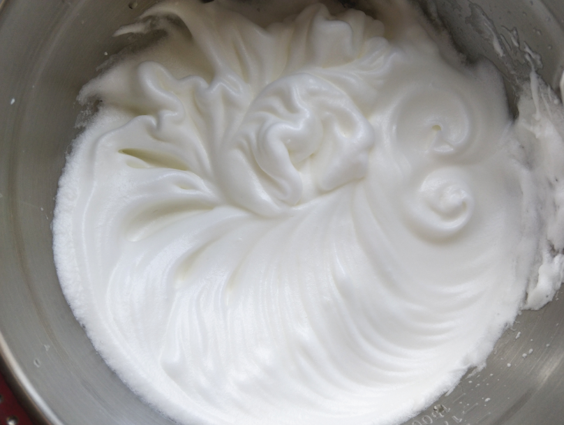 7. 把蛋清打發到如圖,提起打蛋器攪拌頭時,能拉起大彎鉤的狀態,蛋清的打發就完成了。蛋清的打發不要過度,過度的話蛋糕卷容易開裂,也不能打發不足,不足的話烘烤后會塌陷回縮。