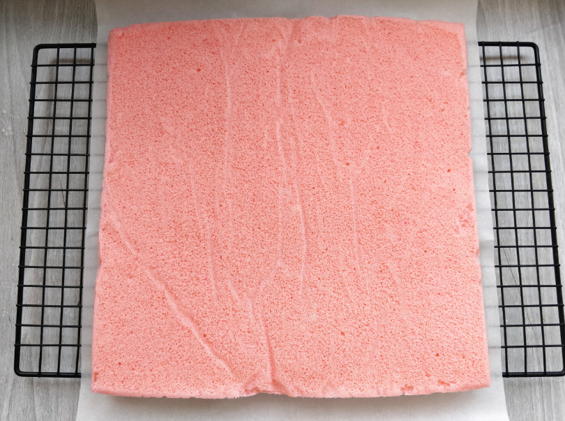 15. 待蛋糕胚晾涼后,撕掉油紙,蛋糕胚表面就成了完美的毛巾面。