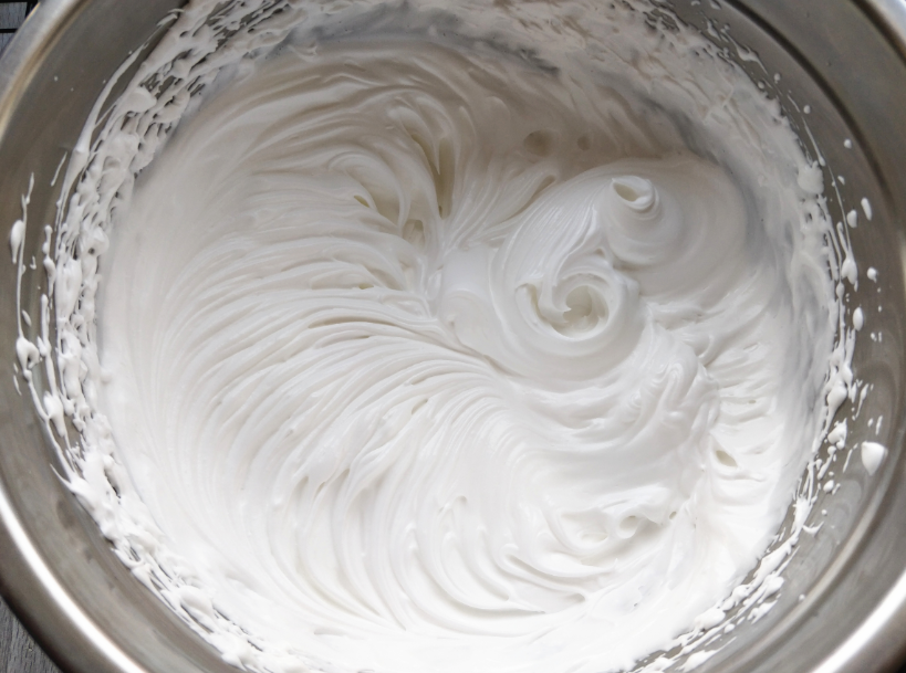 6. 待蛋清被打發到花紋明顯的狀態,加入剩余一半的細砂糖,繼續打發。