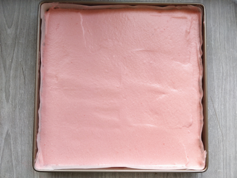 11. 將邊長28cm的金盤中鋪好油紙,把蛋糕糊倒在油紙上,用抹刀將表面和四角都抹平。
