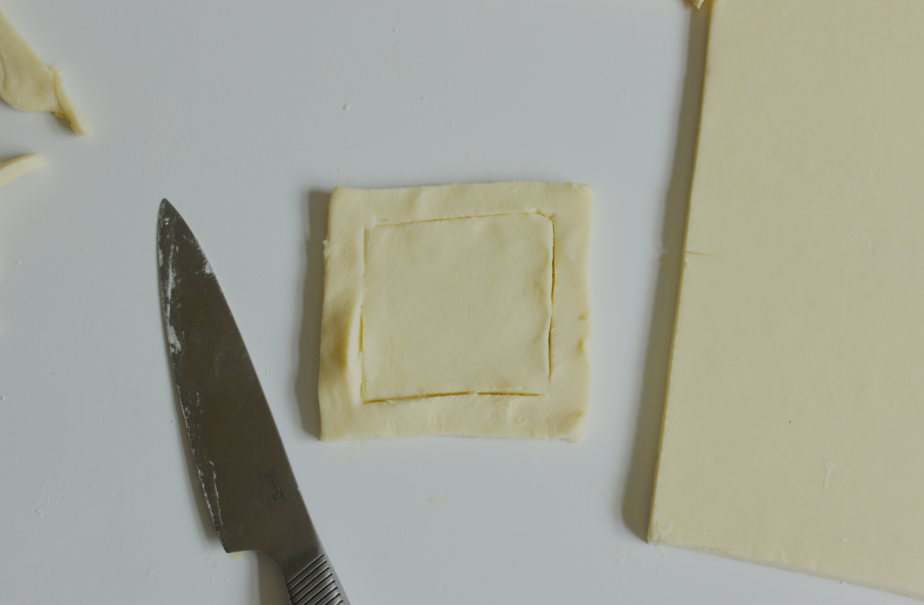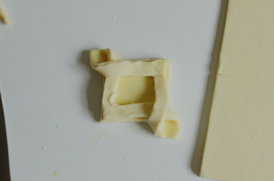 9. 最終搟成厚薄為3mm左右的長方片,修掉不整齊的邊。切成一塊塊的正方形。靠近一厘米左右四方各切1刀,兩邊切開,兩邊連著。刷一層蛋液。