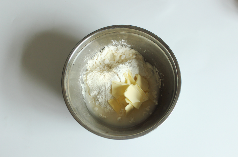 1. 將40克黃油室溫軟化,與高低筋面粉,細砂糖,鹽,冰水,混合。