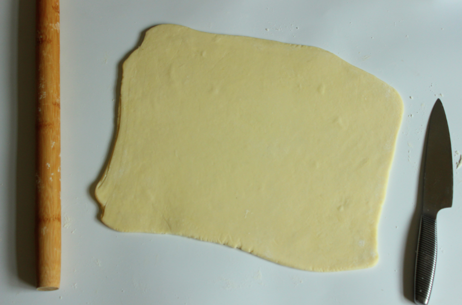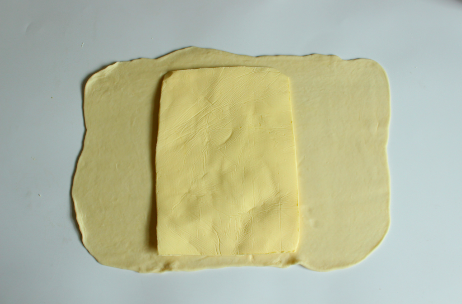 5. 取出松弛好的面團搟成薄長方形面片。黃油片鋪在中間。