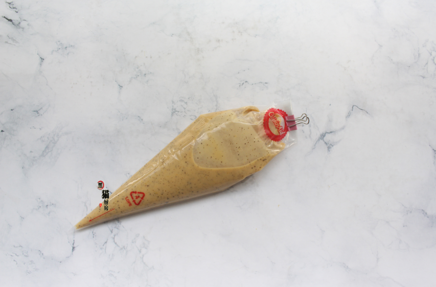 6.把拌好的面糊倒入裱花袋內,封口夾緊,放入冰箱冷藏30分鐘。這個步驟能讓面糊變稠,如果不冷藏,也要室溫靜置15分鐘噢。