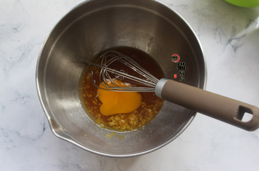 3. 拌勻后加入雞蛋和檸檬屑,用蛋抽拌勻。