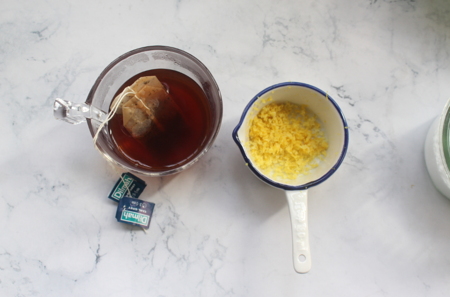 食材:錫蘭紅茶水50克,紅茶渣3克,雞蛋一個(約50克),低筋面粉85克,糖粉85克,泡打粉3克,黃油85克,檸檬皮屑適量。