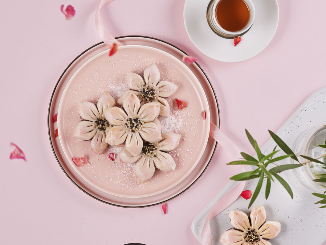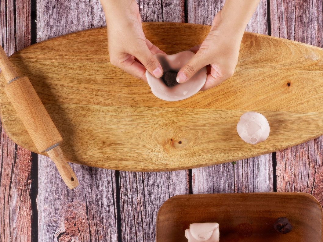 5、將面團搟成圓形,放入豆沙餡,全部包好后略微按扁,切分為6 瓣,尾部捏一下成為花瓣狀,花瓣中間割兩刀不割透。