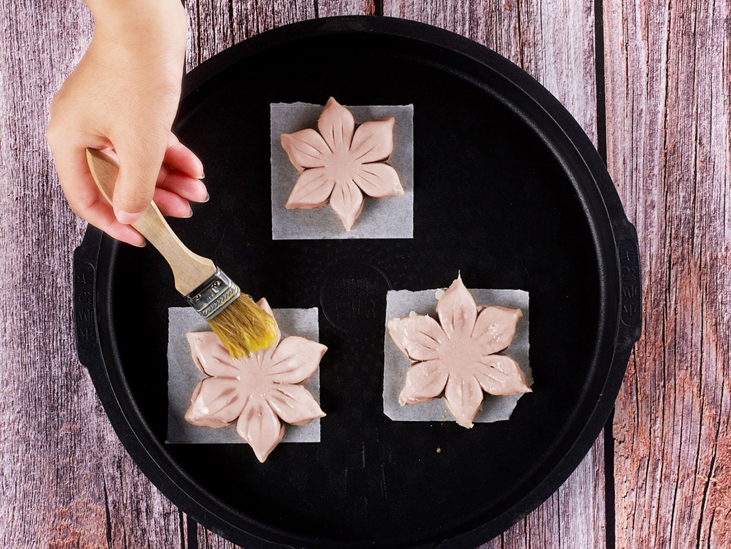 6、升降高度調節至30mm,選擇“水煎包”功能,烘焙紙放入烤盤,上下烤盤同時打開,預熱結束后,再將餅胚放入在烘焙紙上,表面刷蛋液,撒少許芝麻,合蓋煎烤;