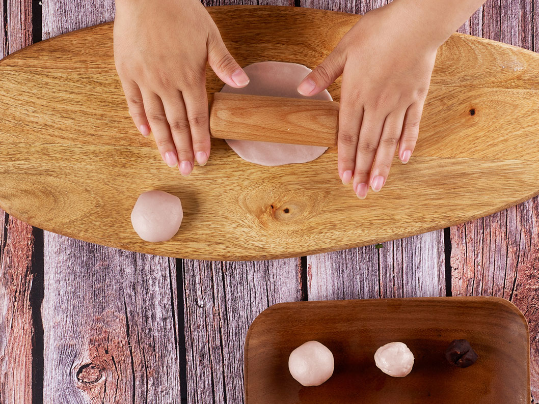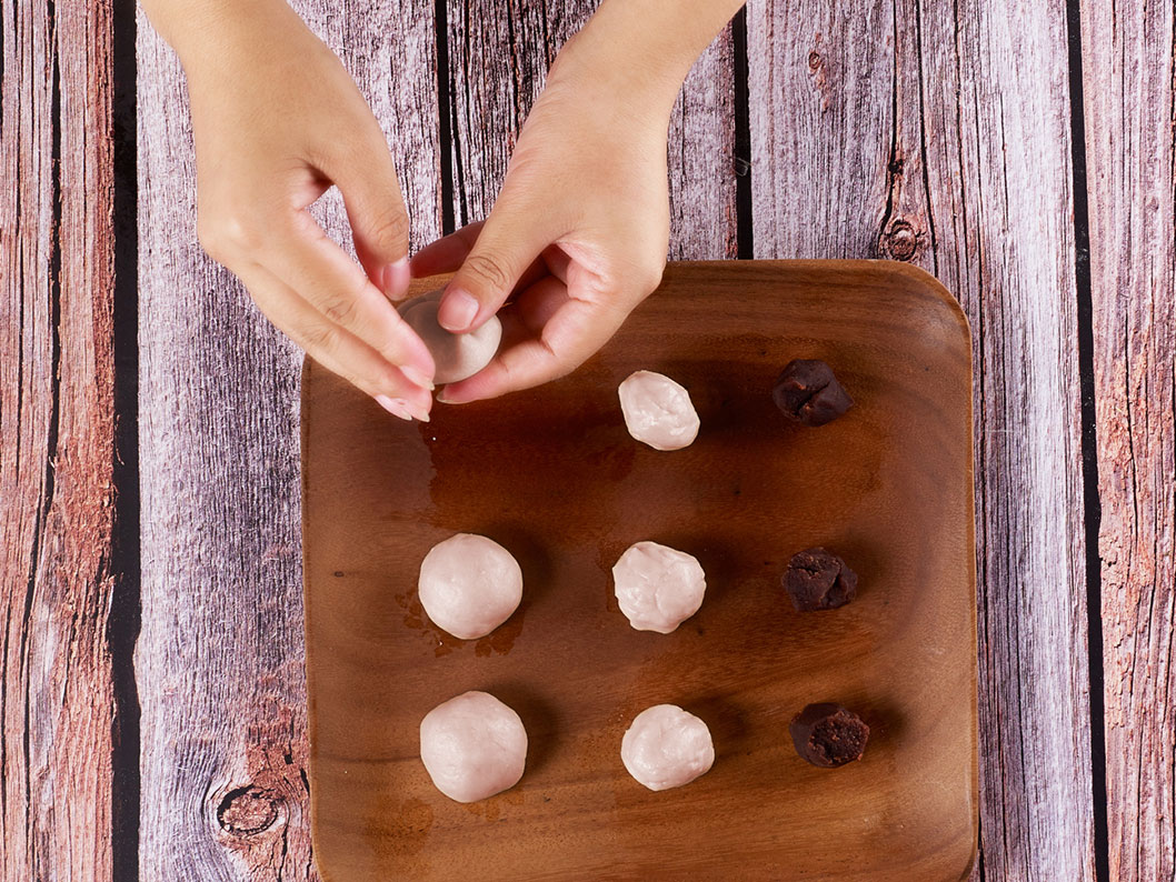 3、將油皮面團和油酥面團平均分成12份,油皮面團搟成圓片,包入油酥,搟成牛舌狀卷起,蓋上保鮮膜,靜置醒發10分鐘;