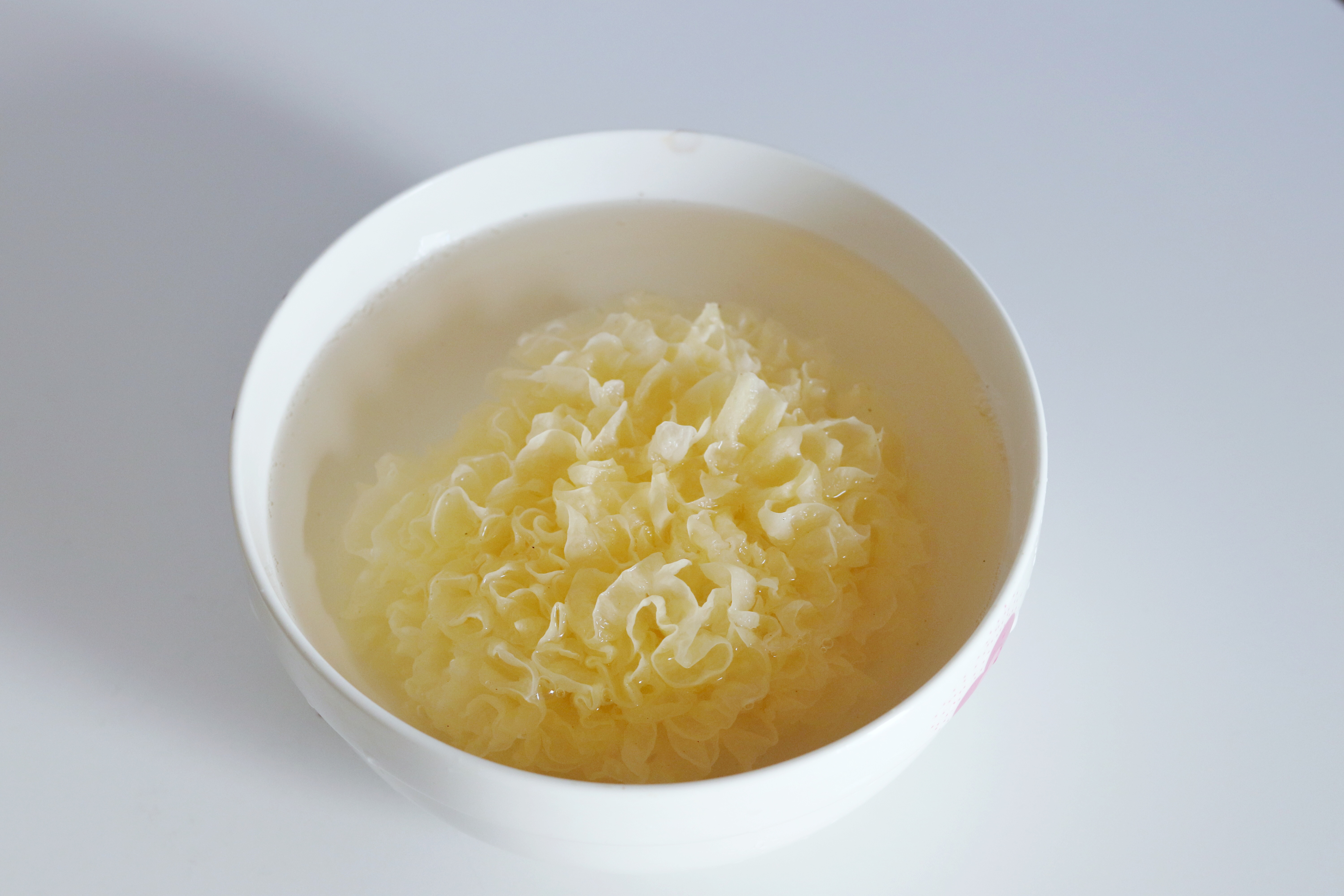 2、把銀耳稍微泡發(fā)至八分清洗干凈去除根蒂部分備用