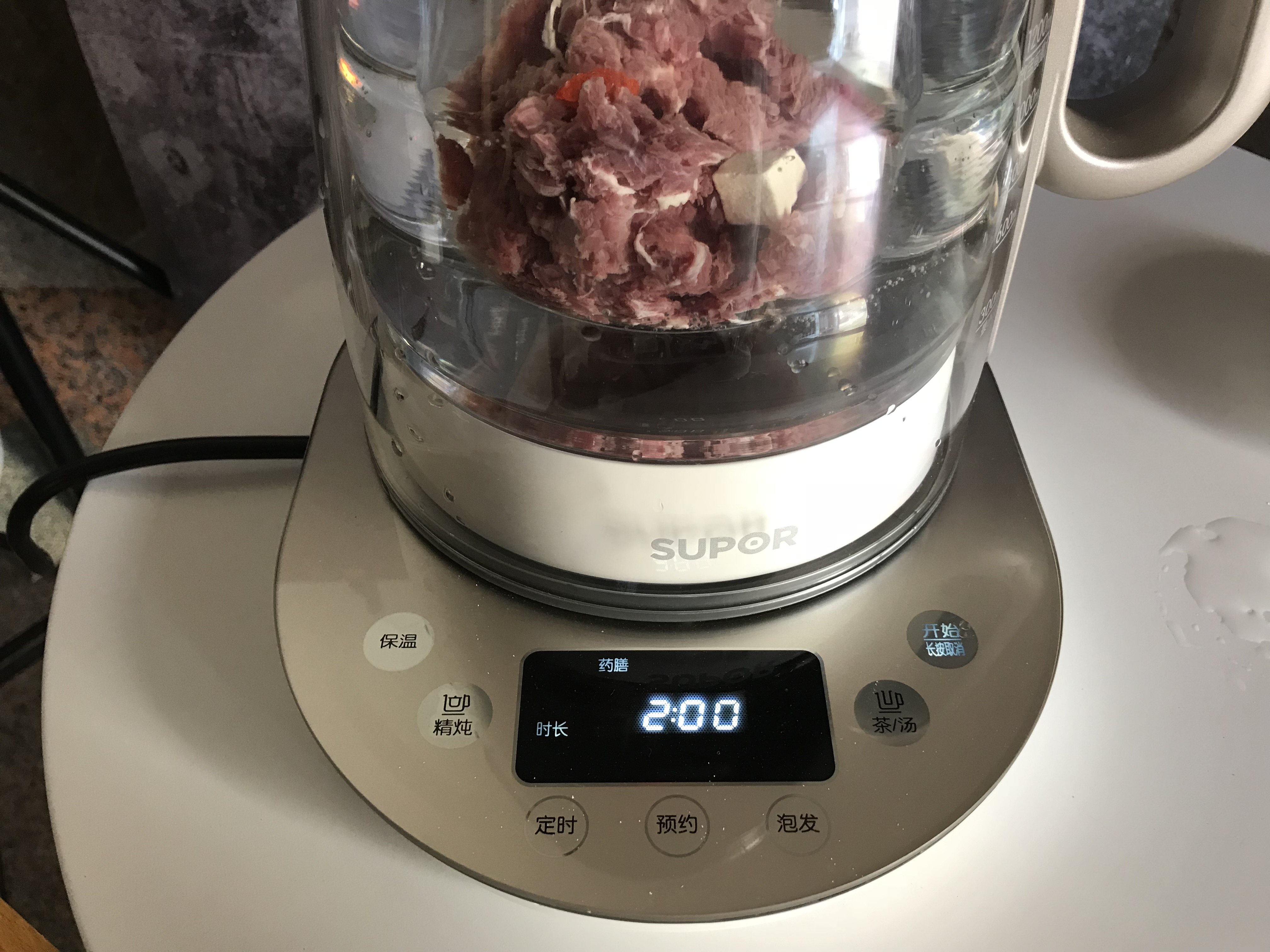 3、把牛肉碎倒入燉盅加入適量的水并倒入藥材