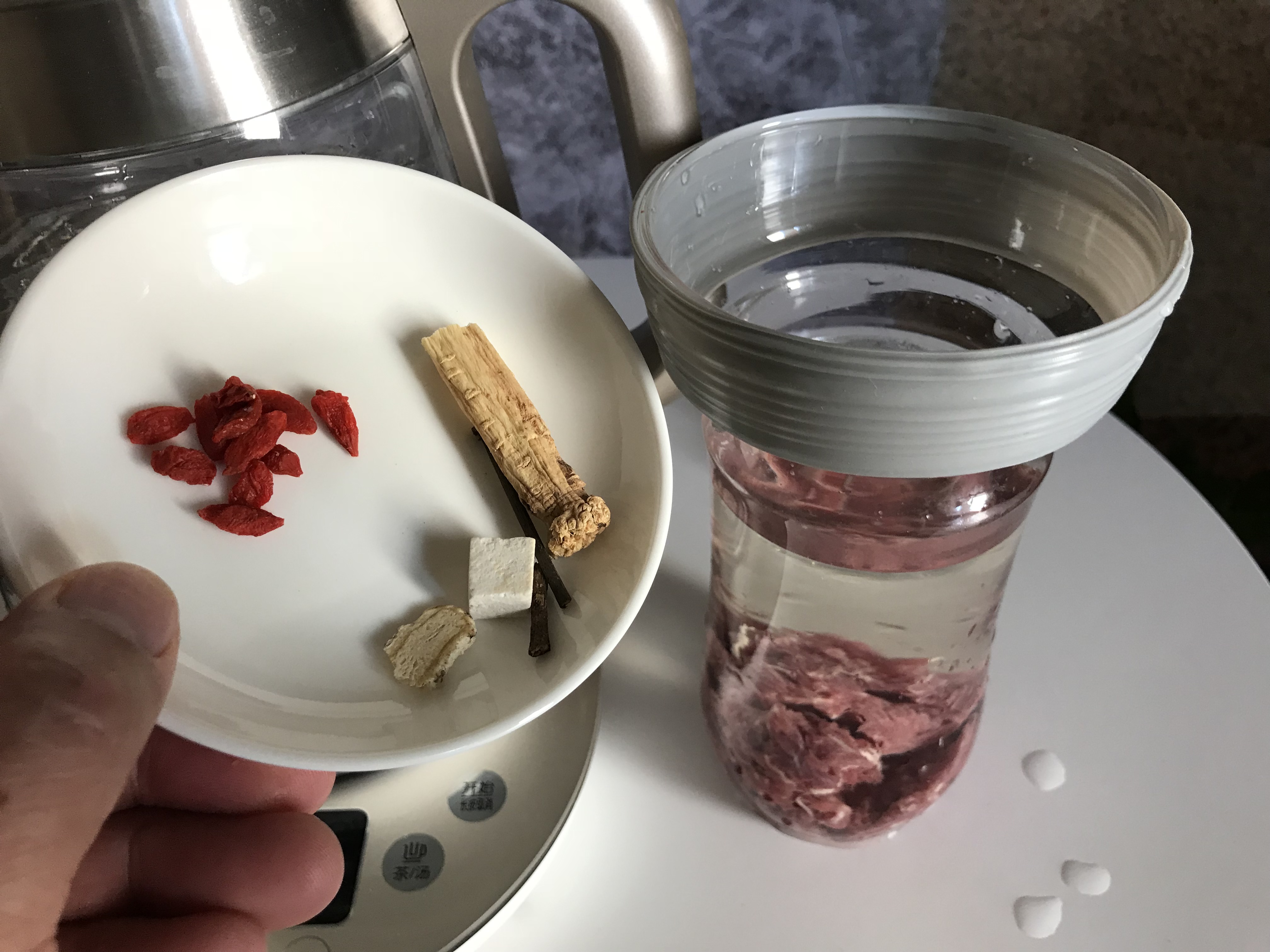 食材:牛肉1小塊、黨參1節、當歸1小片、枸杞少許、桂枝2根、茯苓1塊、鹽少許(一個人份)