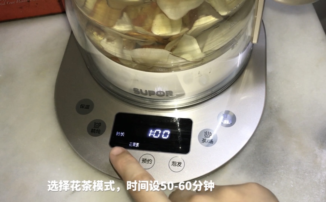 3.蓋上蓋子,選擇花茶模式,時間設定50分鐘,點開始即可。