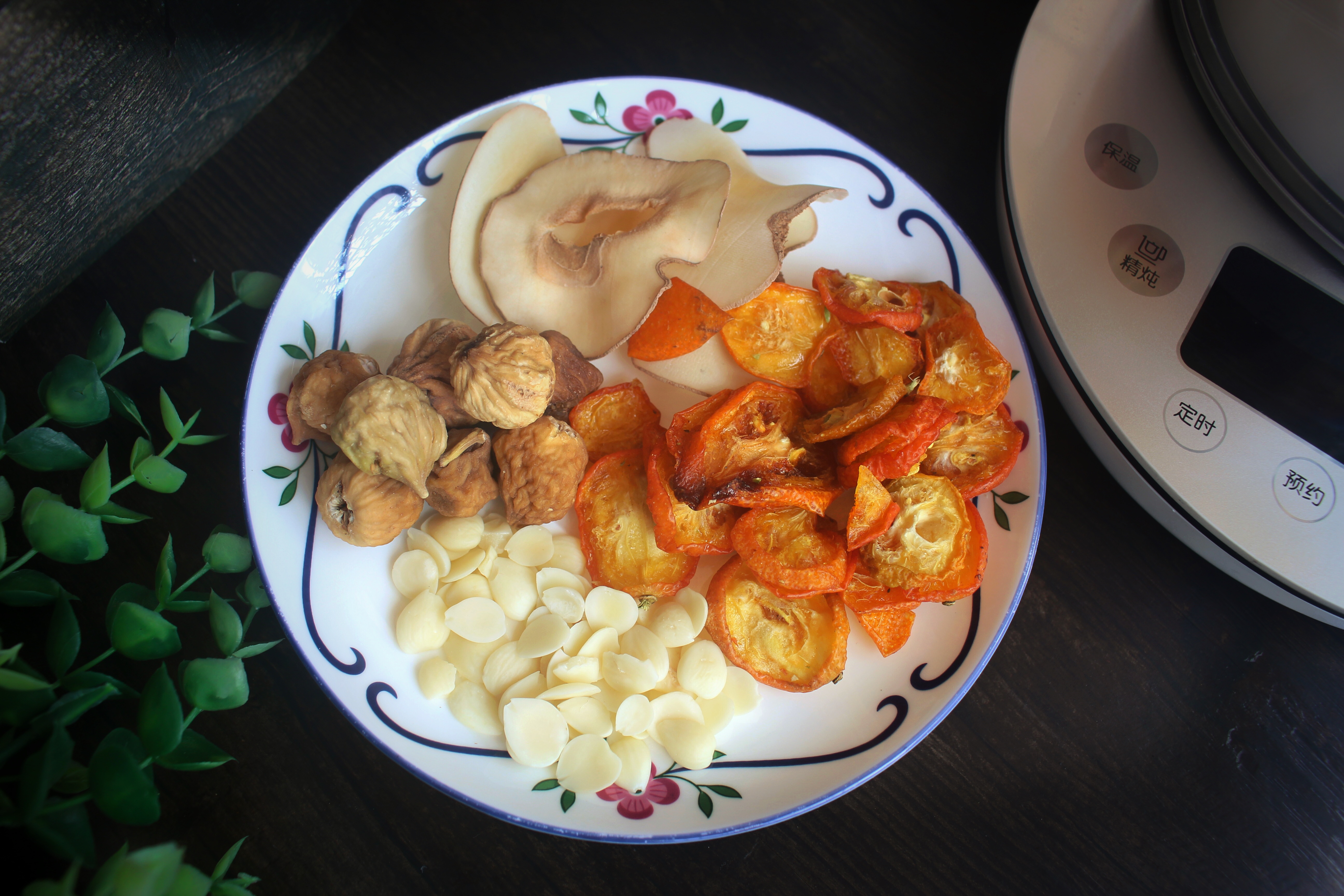 此款養生飲里有金桔干、杏仁、海底椰、無花果干,都是清潤的食材,有止咳化痰的作用。帶皮生曬的金桔保留了大部分的營養成分,味道清香。挑食、消化不好的小朋友也可以用金桔煲水喝。如果有小孩不喜歡杏仁的味道,可以把杏仁替換成雪梨干,也是清潤作用。