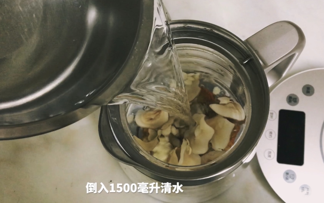 2.把所有材料放入養生壺里,并倒入1500毫升水