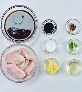 雞中翅6只(約350克),可樂120克,老抽10克(1/3湯勺),料酒10克(1/3湯勺),蔥段3-4段,姜片2片,鹽2克