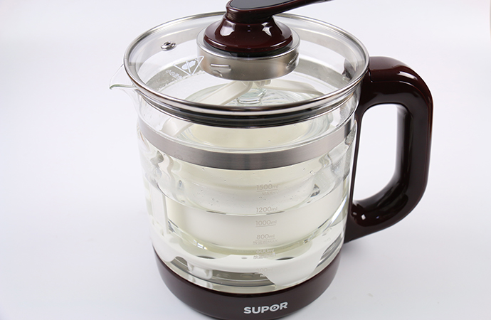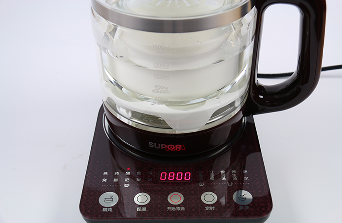 4. 養生壺里加入注入清水,水位在0.6L-0.8L之間,放入玻璃燉盅。