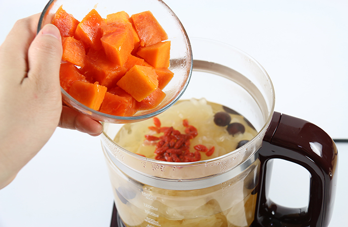 8. 離程序結(jié)束前5分鐘左右,開蓋,加上洗干凈后的枸杞、木瓜。