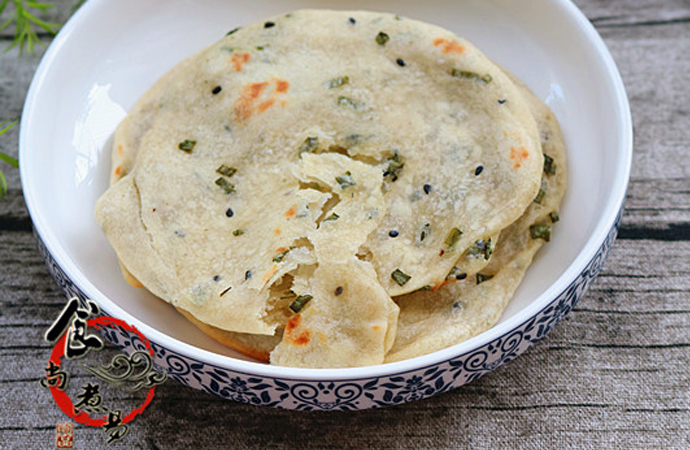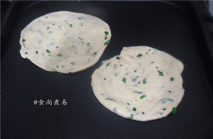11.加入少量黑芝麻烙餅的口感更香,因搟面皮時已經混合上了香油,烙餅時煎盤不用加入食用油了。