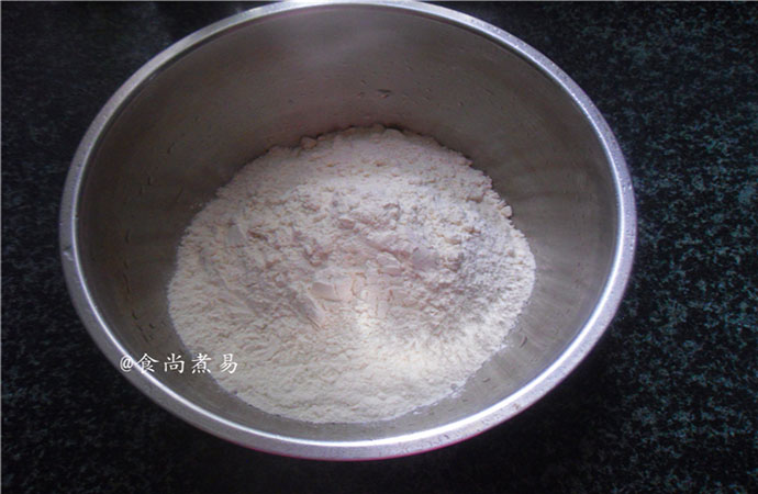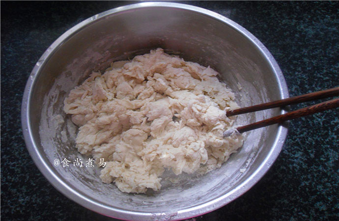 2.慢慢倒入開水,邊倒邊攪拌,直至能揉成柔軟的面團為止;