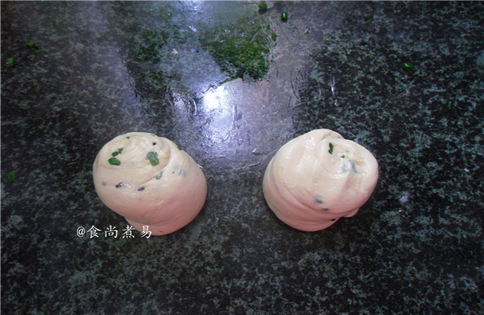 5.案板上涂抹一些自制香油,取出面團揉成薄薄的面皮,再涂抹一層香油,上面撒上一些蔥末,搟開;