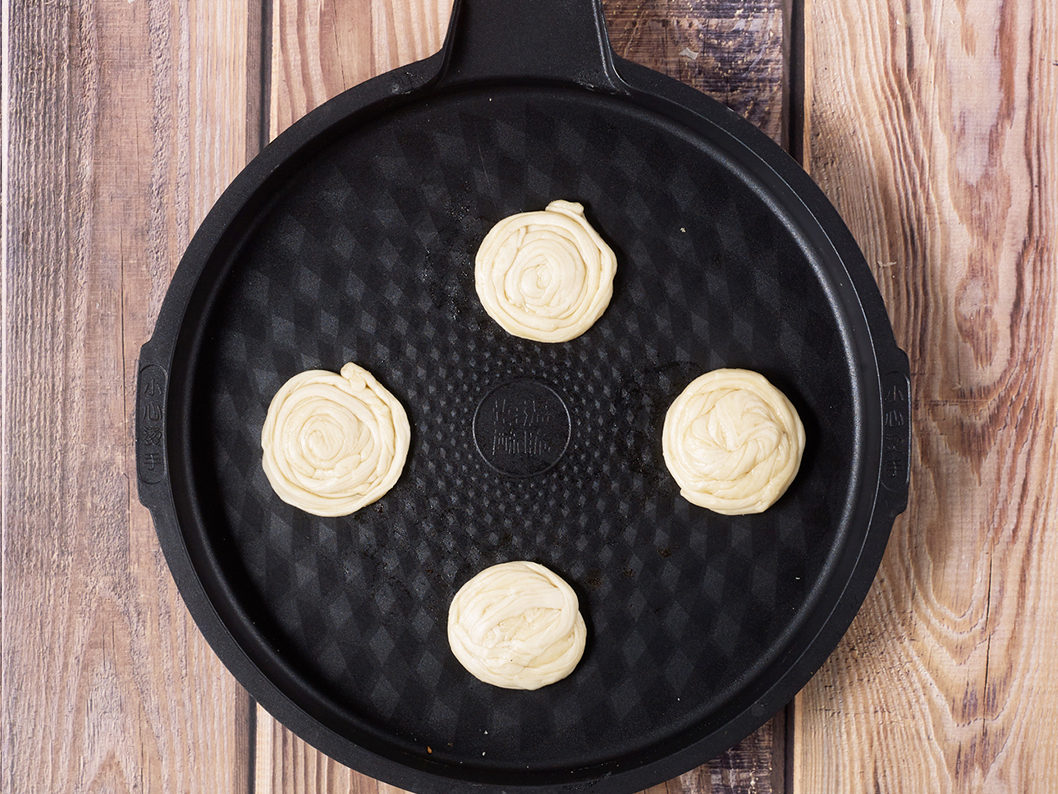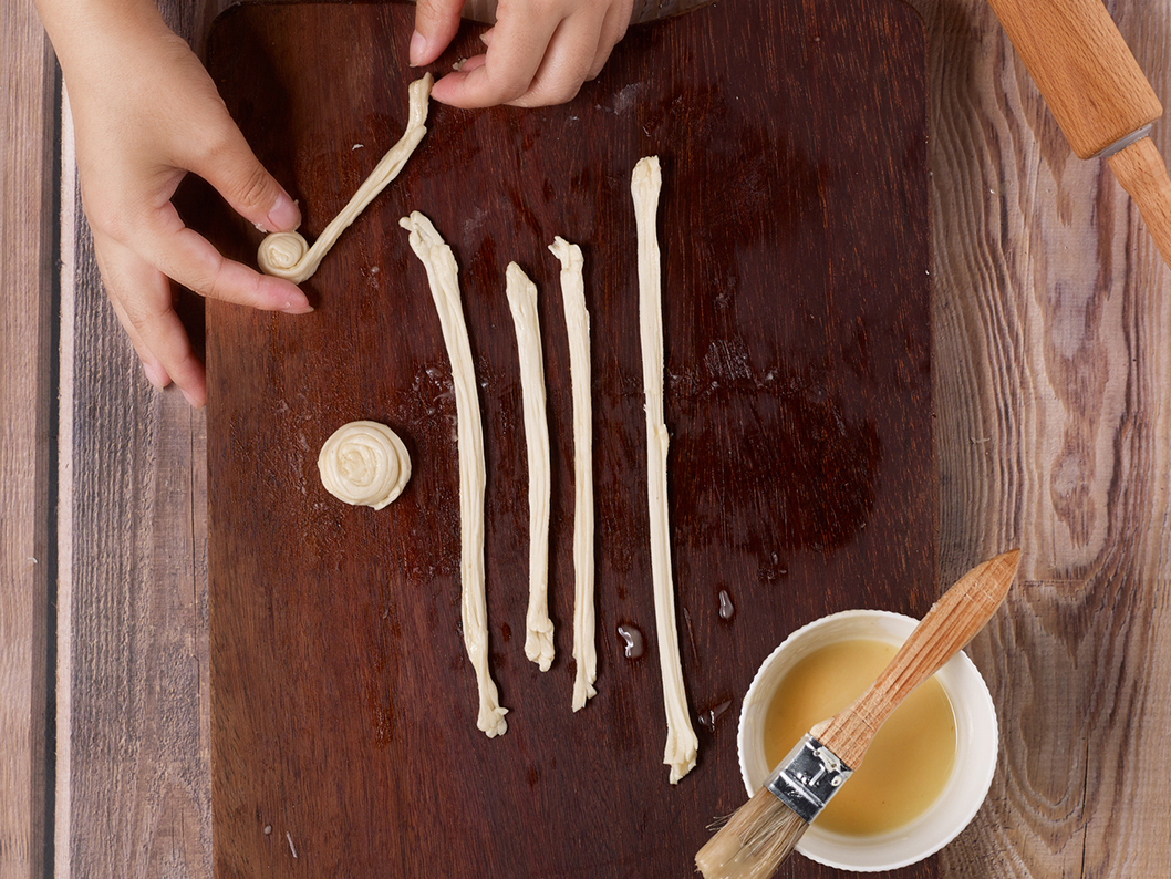 5、3~4條為一組,拉長(zhǎng)后盤(pán)成一個(gè)餅胚,搟成圓餅;