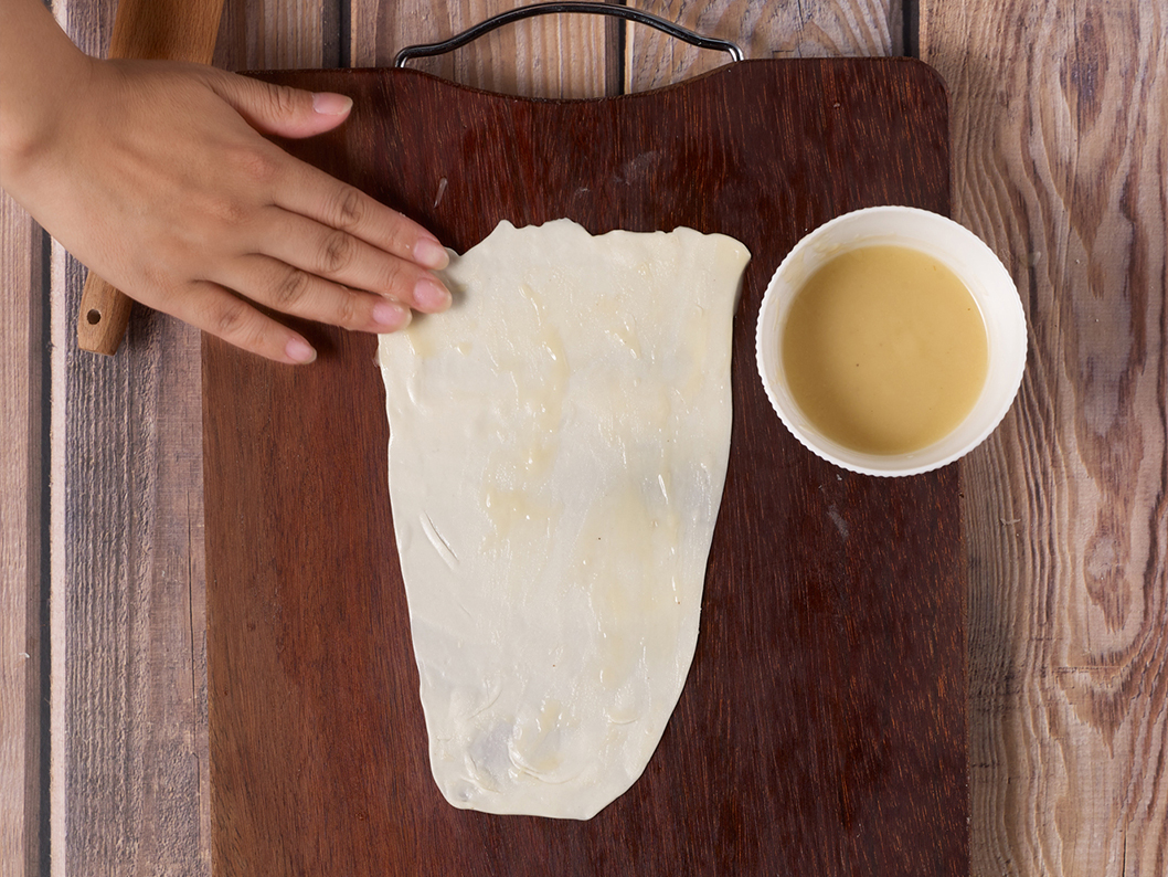 3、將面團(tuán)揉勻,搟成0.5厘米厚的薄片,均勻地抹上一層油酥,再撒上一層蔥末;