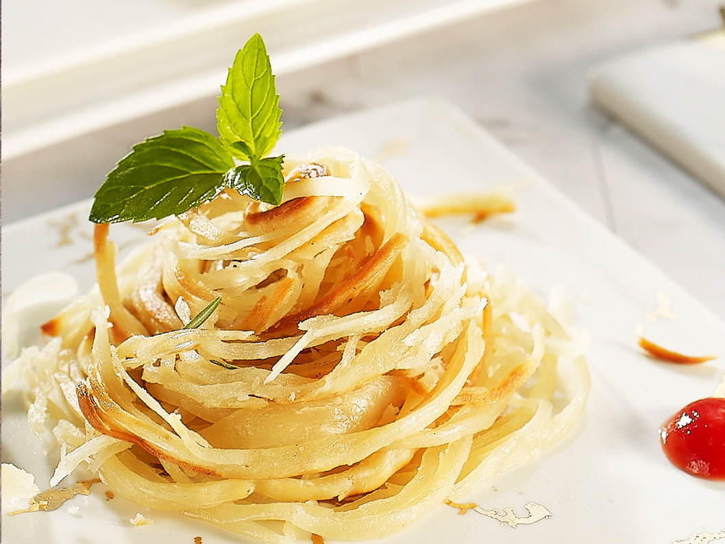 4、將面片從兩頭卷起,用刀切成1cm寬的條狀;