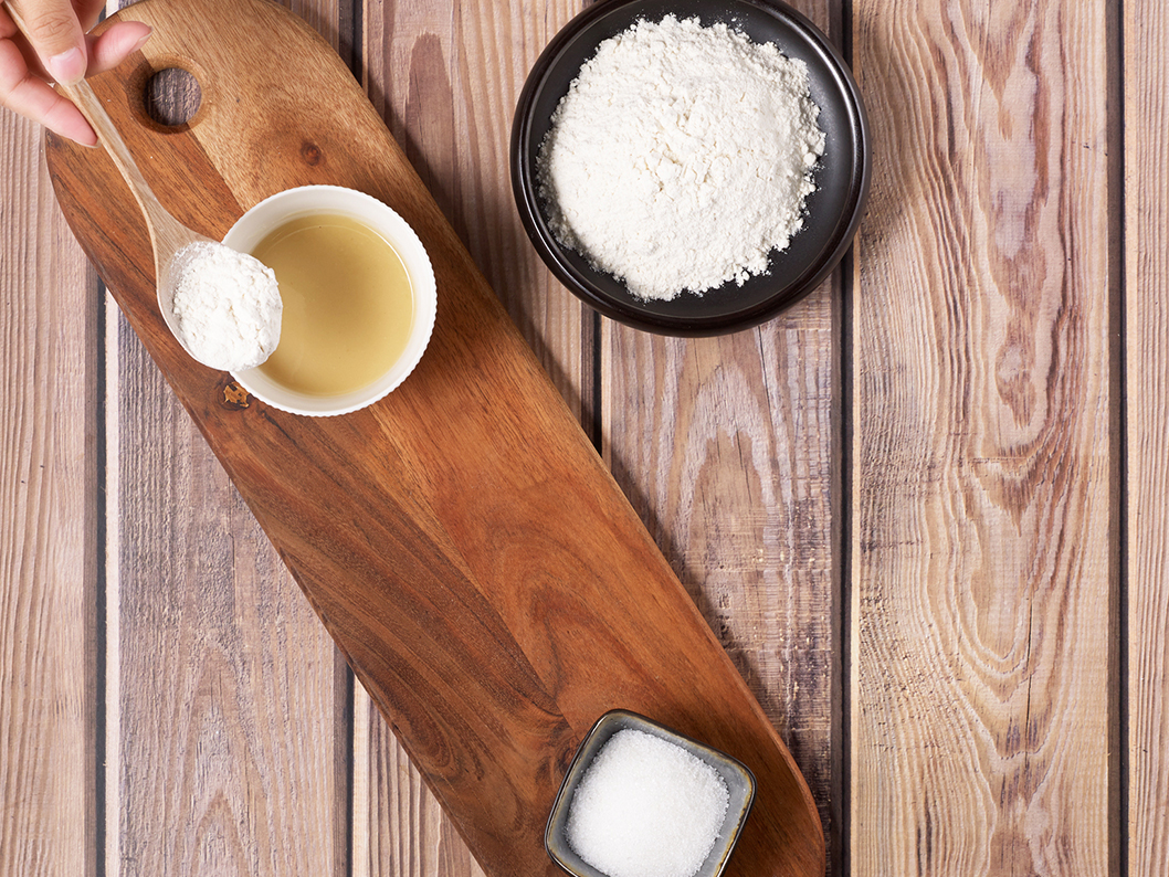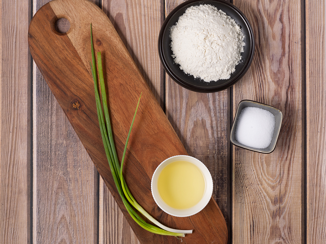 配料:泡打粉1/4勺、食鹽半勺、水290g、五香粉半勺、食用油100g、大蔥1根