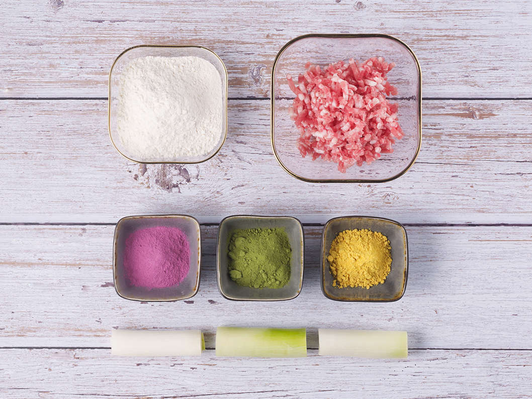 1、面粉分為3份,分別加入菠菜粉、紫薯粉、南瓜粉,放入適量水,并分別和面,揉成面團后醒20分鐘;