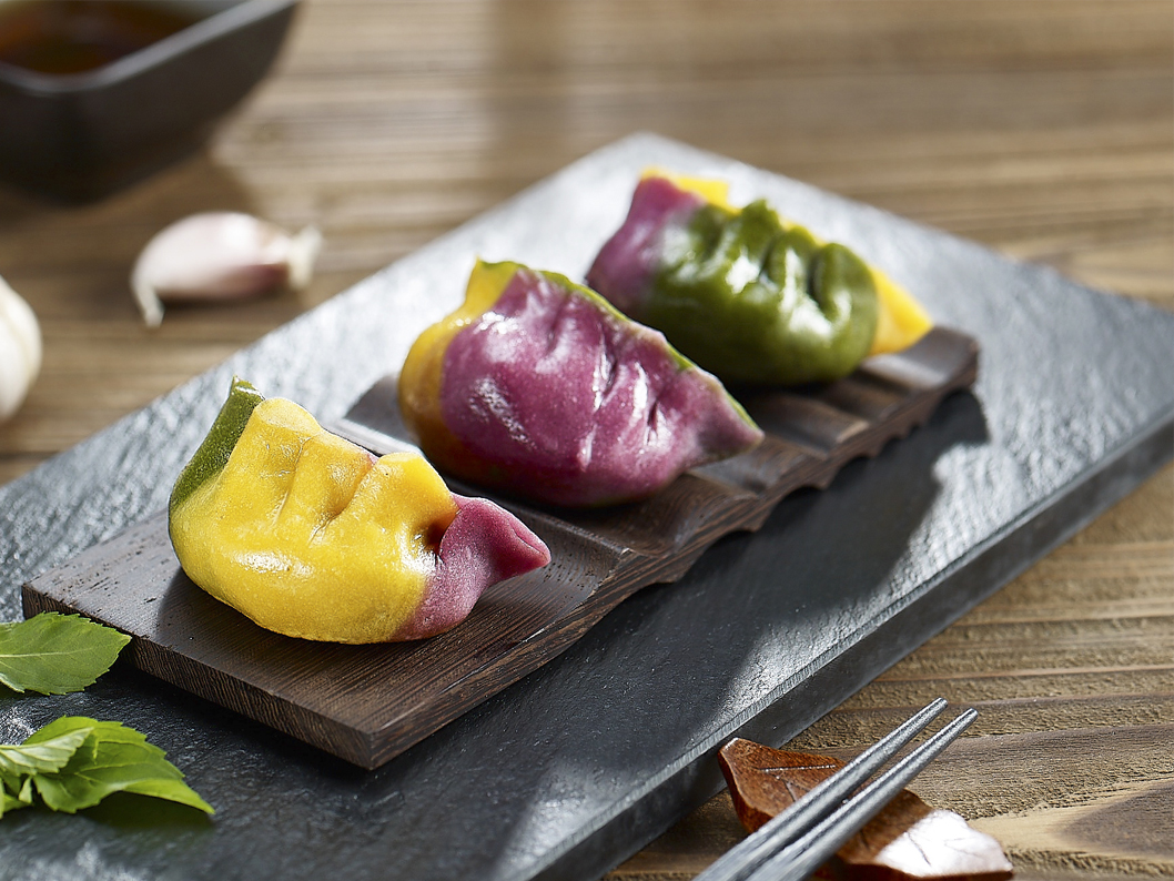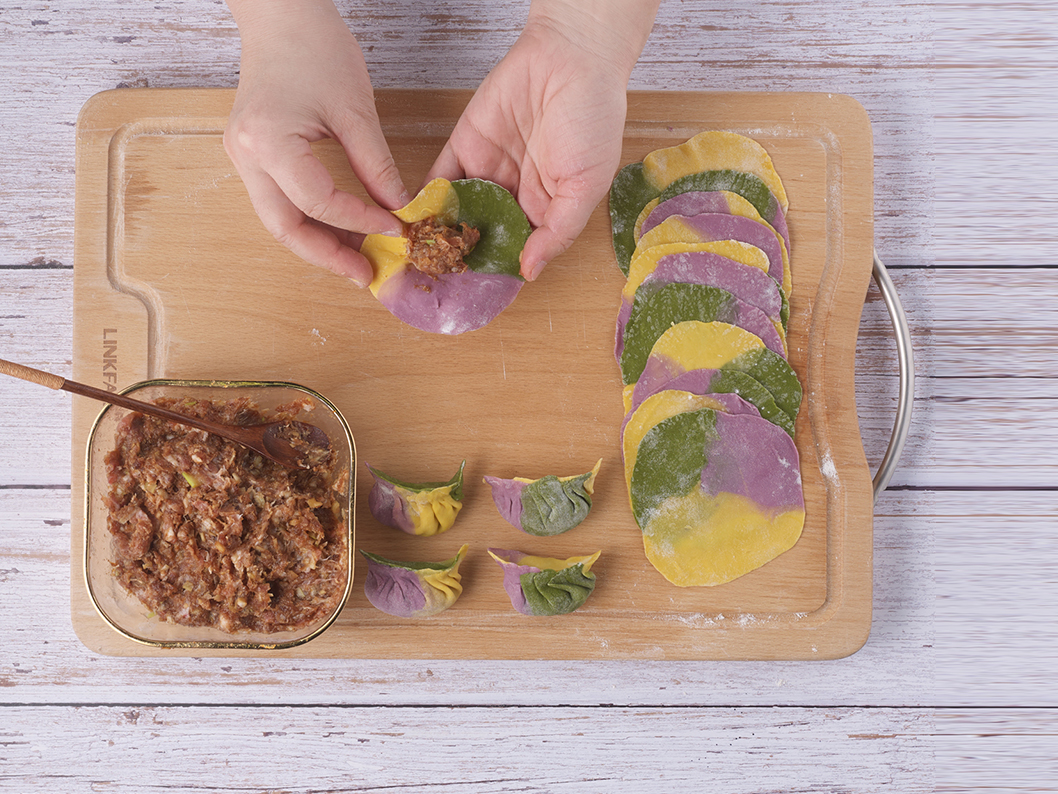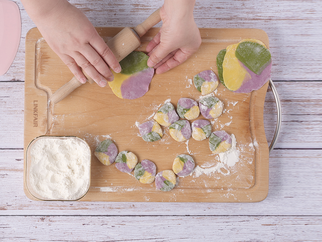 3、三種顏色面團分別揉成長條,再合在一起搓成三色長條,切成大小合適的劑子,按扁后搟成圓形餃子皮;