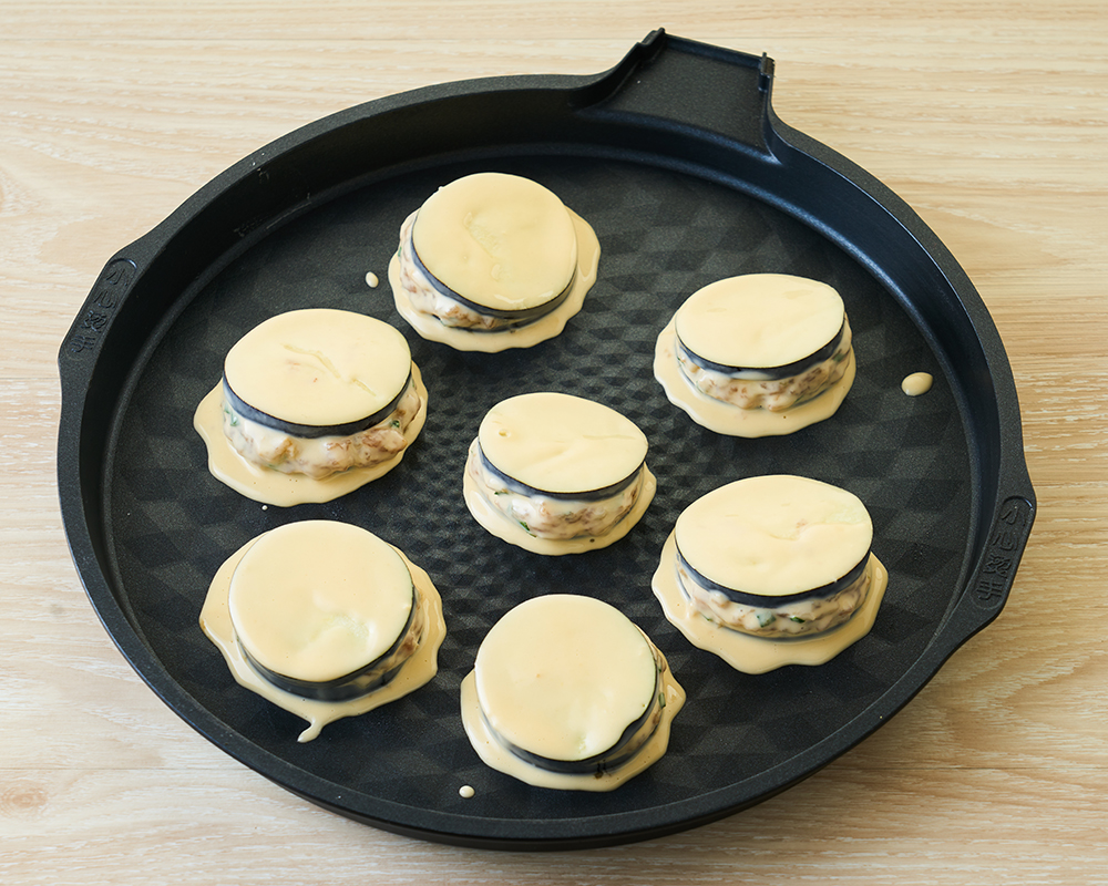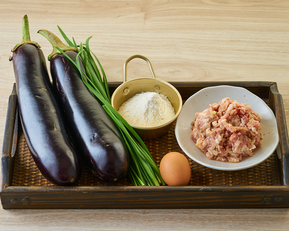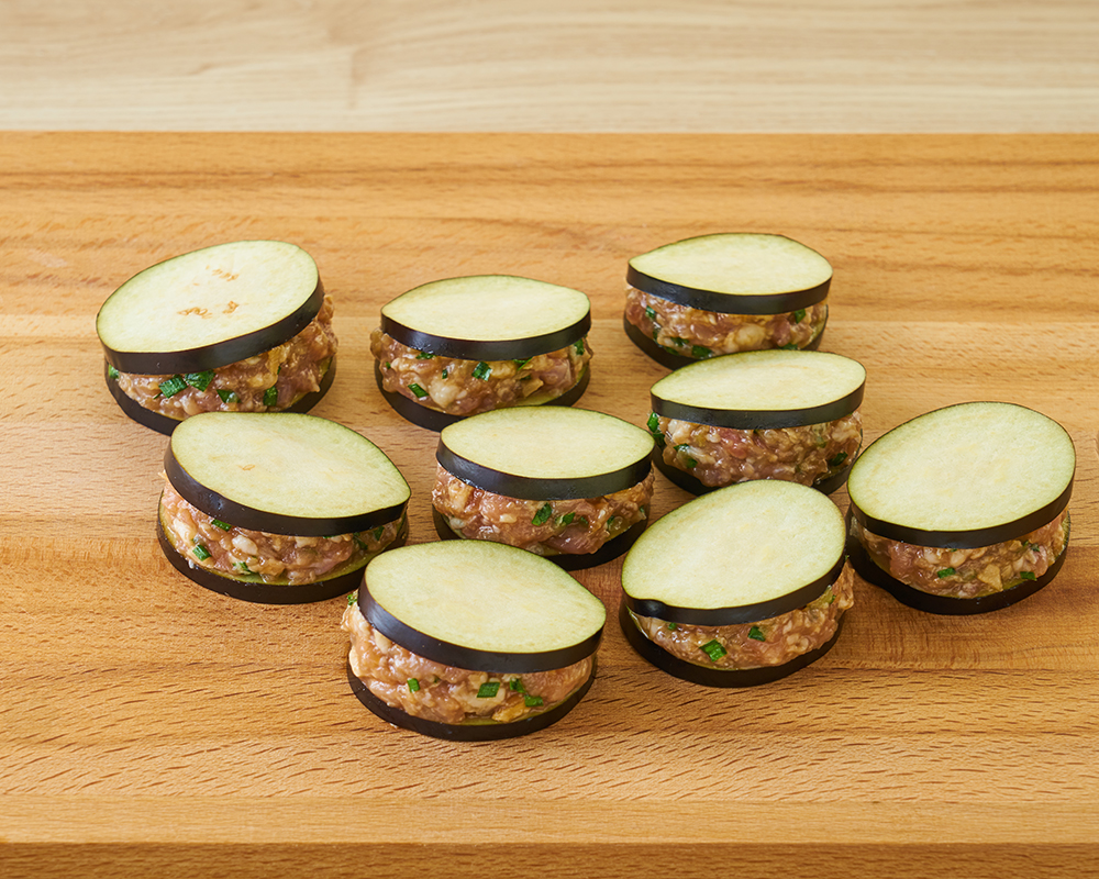 2、茄子切片,2個一連不要切斷,切好的茄子中間抹上生粉,將適量肉餡放入2片茄子中間;