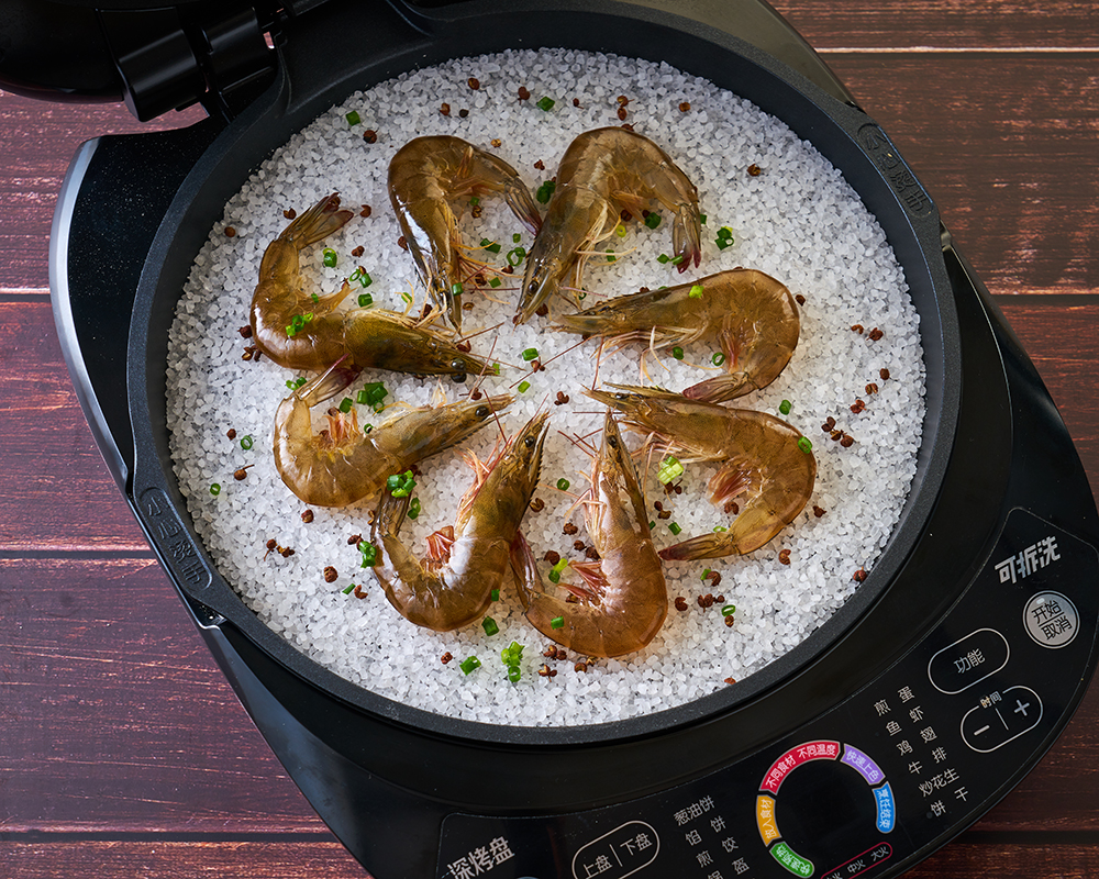 3、升降高度調節至25mm,選擇“燒烤”功能,燜5~8分鐘,待蝦全部變紅并卷曲即可食用;