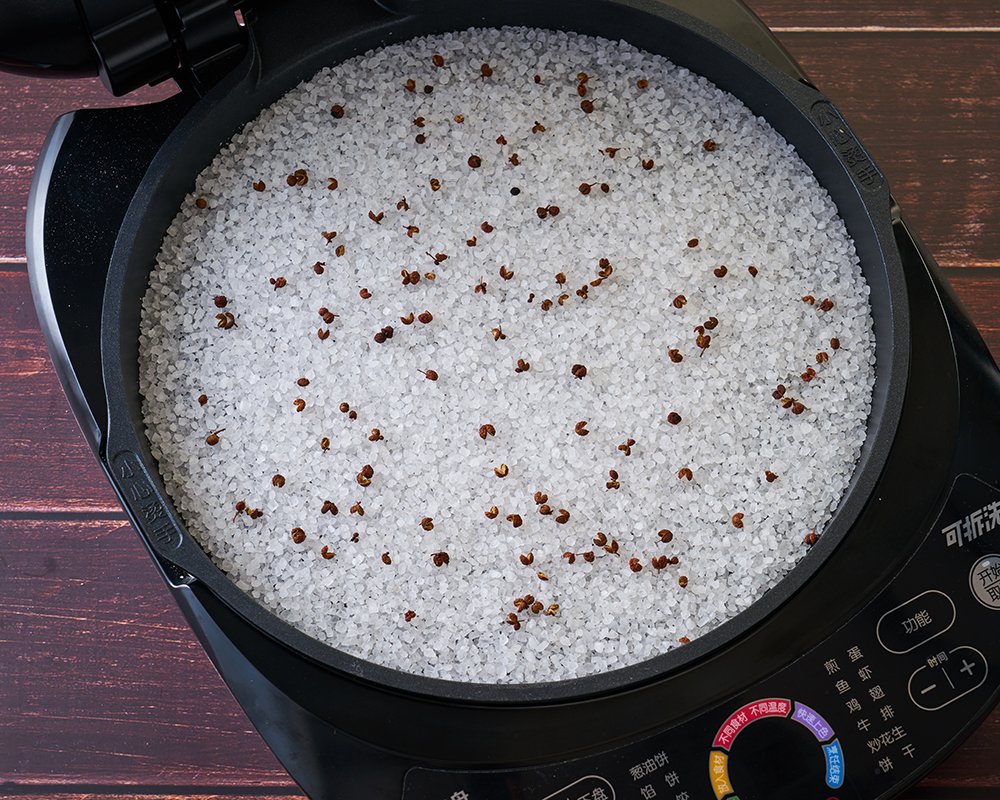 步驟: 1、將錫箔紙鋪在煎烤機烤盤上,均勻鋪上鹽,表面撒上花椒、辣椒段;