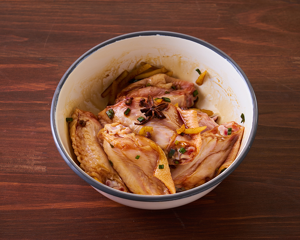1、洗凈的雞翅背面劃幾道口,焯水后,倒入檸檬汁、五香粉、鹽、料酒和生抽,腌制2小時;