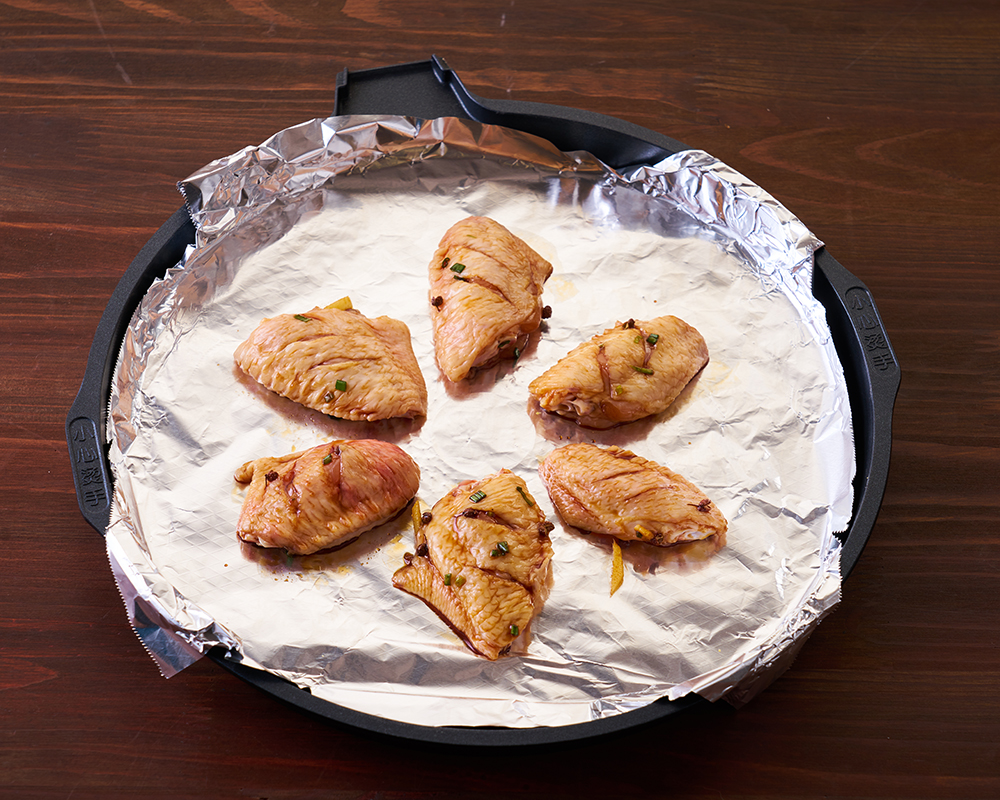 2、升降高度調(diào)節(jié)至25mm,選擇“雞翅”功能,烤盤刷適量食用油,預(yù)熱后,雞翅放入烤盤;