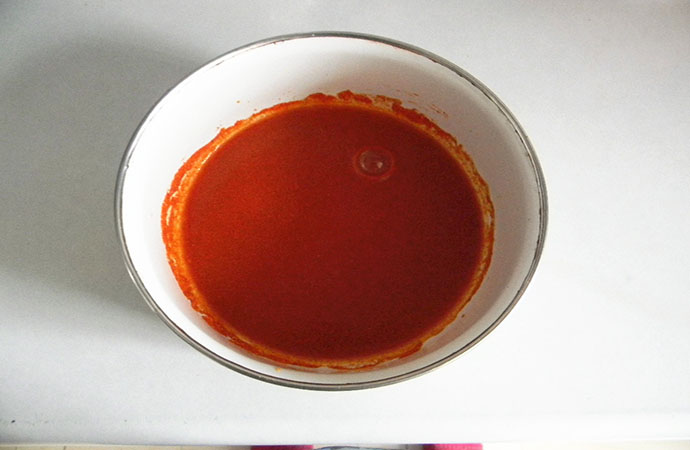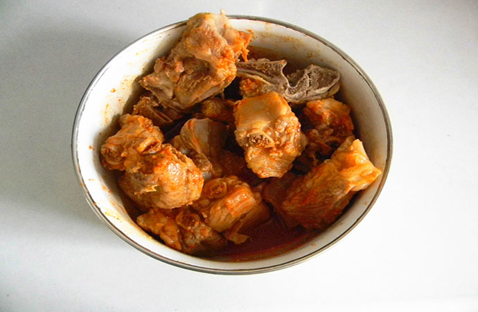5.煮好的排骨撈出控干水分,奧爾良烤肉料用1:2的比例和水溶解;